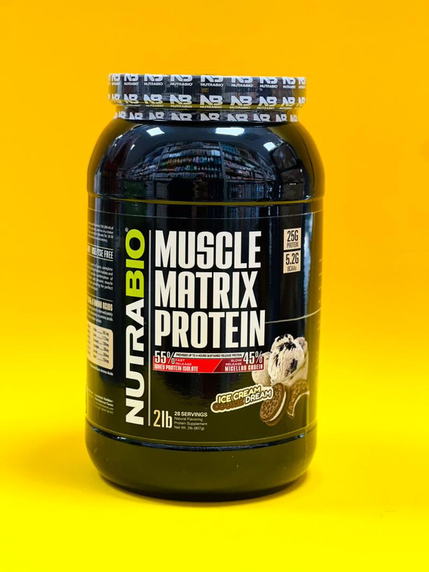 پودر پروتئین ماسل ماتریکس نوترابایو 907 گرم یک مکمل پروتئینی ترکیبی است که برای عضلهسازی، تسریع ریکاوری و حفظ توده عضلانی طراحی شده است. این محصول حاوی 25 گرم پروتئین خالص در هر سروینگ (حدود 30 گرم)، شامل 55% پروتئین وی ایزوله و 45% کازئین میسلار، با سرعتهای جذب متفاوت برای تأمین مداوم اسیدهای آمینه است. برند نوترابایو (NutraBio)، تولیدشده توسط شرکت پاک سلامت تامین در ایران تحت لیسانس آمریکا، این مکمل را در طعمهای کوکی بستنی، شکلات هلندی، وانیل آلپاین و شکلات کره بادامزمینی عرضه کرده است. این پودر برای ورزشکاران بدنسازی، فیتنس و افرادی که به دنبال رشد عضلانی و ریکاوری طولانیمدت هستند، مناسب است.